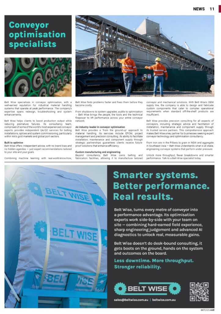 Safety, Strength and Shotcrete: The Incycle Advantage EPCA advancing mining electrification Building skills, building communities Industry-leading dust suppression systems get an upgrade Clean solutions for cleaner air Psychosocial wellbeing to have the biggest impact on Australia’s resources workforce First-of-its-kind automated lab technology at Onslow Iron Queensland company wins Australia’s top safety innovation award Conveyor idler failure got you (shut) down? Australia unlikely to embrace deep-sea mining Aquila mine named innovation award finalist Sandvik launches surface drilling training simulator High-performance polyurethane lined pipe: Built for durability Turnkey dredging systems for Australia’s mining sector Powering forward Port of Brisbane delivers strong trade for FY25 Wind turbines begin 1000km journey to St Ives All Civil makes the switch to Komatsu Pilbara Ports unveils climate action plan BHP greenlights $1.4b Port Hedland investment Understanding motor reliability From aging to agile: Getting sustaining capital right Westrac inspires next generation at RTS Built for strength: ITM Mining’s solutions for hydraulic mining excavators The first intelligent oil-water separator Securing operational technology in mining Specialised engineering for complex mining challenges Mining Matters Cancer researchers unlock ‘DNA code’ of critical minerals The missions making asteroid mining a reality Fosterville expansion gets the green light VHM lays the building blocks for Goschen project CTTW2025 highlights innovation and global partnerships Turning battery waste into a local resource E-Plas champions mining’s quiet achievers Keep your crew cool Tough enough to thrive in the harshest of environments Steuler expands your horizons Think change. Think Breight All-electric forklift. Mine-ready. Built for heavy loads Gold, gold, gold WT Hydraulics and Festo Join Forces to Revolutionise Mining and Industrial Automation Closing the loop: How Acu-Tech supports mining with ESG in action Tecweigh: The Future of Heavy-Duty Bulk Material Weighing Your partner in strategic asset management Driving the future of the mining industry MLT New Generation Super-Screw® FRAS/Oil Resistant Oli Group: Driving innovation and reliability in mining & quarrying Titeline Drilling: Automating the future Billions of Litres, Zero Compromise: Inside Banlaw’s Fuel Management Revolution Lighting Up the Underground Conveyor optimisation specialists Engineering innovation at scale: How Innovative Mining Services is redefining safety, productivity and reliability in materials handling How DTN APAC’s inversion and blast dispersion forecasting help the mining industry Emtivac Engineering: The vacuum powerhouse behind Australian industry A simple solution to a complex problem Powering progress through innovation Leader in Manufacturing Innovation Powering Mining with Practical Solutions Eagle Forklifts: Powering Australia’s mining logistics with smarter, safer machinery The cable management specialists Australia’s spare parts distribution centre The future of mining is in Australia Securing global supply chains at CMC2025 The reality of Australia’s EV uptake The world’s first carbon-neutral lithium product Aussie mine boss – a true Australian success story Practical project support from strategy to delivery Improve worker wellbeing with a new toolkit from Edith Cowan University Liontown’s lithium liftoff Has Australian lithium been left in the lurch? A rocky reporting season for Australia’s resources sector The Australian Mining Review October 2025 Edition