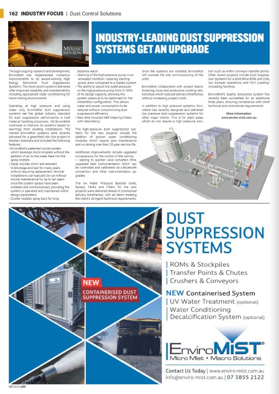 Through ongoing research and development, EnviroMist has implemented numerous improvements to its award-winning High Energy Micromist Dust Suppression Systems. The most recent systems delivered offer improved reliability and maintainability, including specialised water conditioning for harsh mining environments.