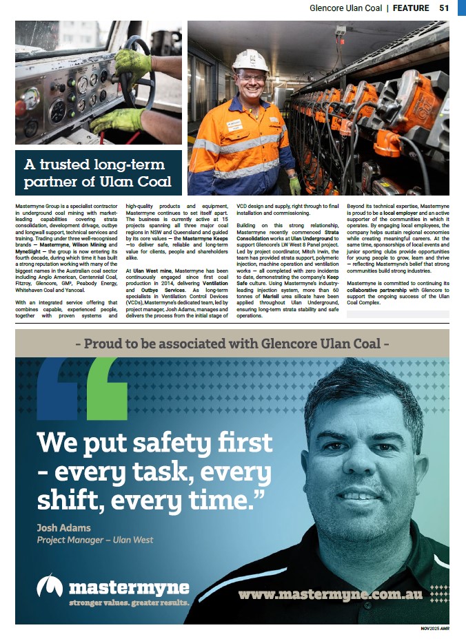 Building on this strong relationship, Mastermyne recently commenced Strata Consolidation works at Ulan Underground to support Glencore’s LW West 8 Panel project. Led by project coordinator, Mitch Irwin, the team has provided strata support, polymeric injection, machine operation and ventilation works — all completed with zero incidents to date, demonstrating the company’s Keep Safe culture. Using Mastermyne’s industry-leading injection system, more than 60 tonnes of Marisil urea silicate have been applied throughout Ulan Underground, ensuring long-term strata stability and safe operations.