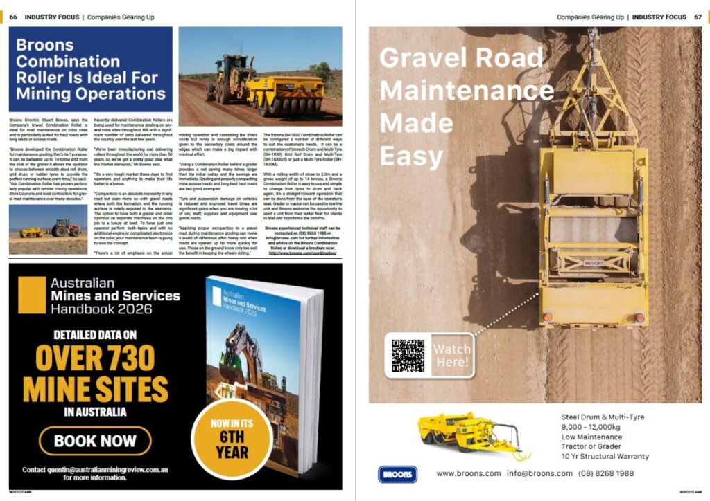 Broons Director, Stuart Bowes, says the Company’s towed Combination Roller is ideal for road maintenance on mine sites and is particularly suited for haul roads with long leads or access roads.
