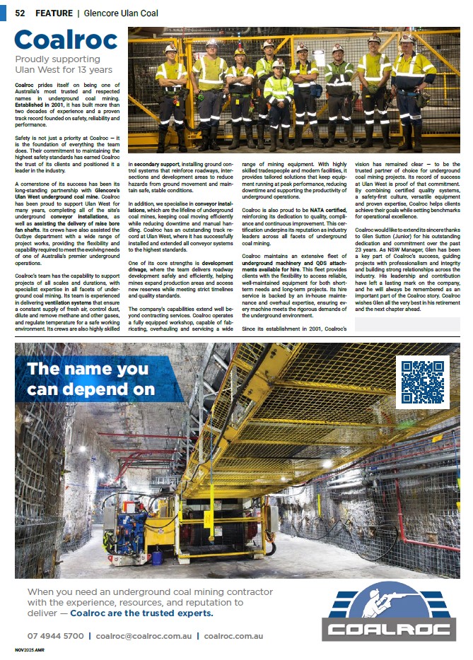Since its establishment in 2001, Coalroc’s vision has remained clear — to be the trusted partner of choice for underground coal mining projects. Its record of success at Ulan West is proof of that commitment. By combining certified quality systems, a safety-first culture, versatile equipment and proven expertise, Coalroc helps clients achieve their goals while setting benchmarks for operational excellence.
