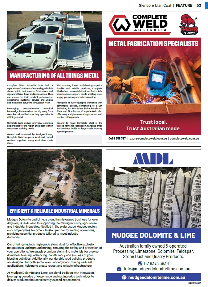 Raising the standards in lifting, rigging and crane hire since 2008 Efficient and reliable industrial minerals Manufacturing of all things metal Coalroc – Proudly supporting Ulan West for 13 years A trusted long-term partner of Ulan coal A history with Ulan coal Mining and ventilation solutions since 1998 Robowash Turbotech From breakdown to benchmark Power Control Products Compressed air, clean power Transmission repairs and replacements made easy Driving innovation and reliability in Australia’s heavy industries Continuous innovation Expert equipment maintenance solutions TrackHAWC by FMS Group is state-of-the-art track show system designed for superior performance in tough operating conditions Widespread thunderstorms captured by DTN APAC’s Oracle and TLN across remote Australian mining areas Power of innovation Breathe easier work safer The remote exploration drilling specialists Why self priming wins Viva Energy opens new Karratha lubricants facility Complete dust suppression solutions Mining’s digital revolution Wear products you can rely on Proven performance and smarter savings with ITR Pacific’s Futura GET range The Wear Plate difference High-performance polyurethane lined pipe CMI 11kV Aluminium Adapter for above ground mining Varnish removal made easy Minesite – Village fitouts, designed for life beyond the shift Australia’s stand out crane company Conveyor Idler Failure got you (Shut)down? Leading fleet information management software Don’t waste on waste Modec Connect Solution When failure is not an option Preparing for the heat: protecting workers from heat-related risks Smart Crushing, adapted to you HIGHLUX Smart Solar Lighting Broons combination roller is ideal for mining operations Stope bollards Steuler expands your horizons Shaping the future with aerial and underground LiDAR Engineering solutions for field applications The future of electric lifting Speed Queen Australia’s first fluorite project Securing ‘ex-China’ graphite supply Smart mining, shared Country Mining Matters Glencore’s Ulan Coal Complex: Shaping the future underground Is Dutch Disease still plaguing Australia? Australia must focus on fluorine Good, old-fashioned hard yakka Australia’s slice of silica AIMEX 2025: South Australia stakes its claim in global mining AEGC2025: Shaping the future of geoscience in Perth The Australian Mining Review November 2025 Edition