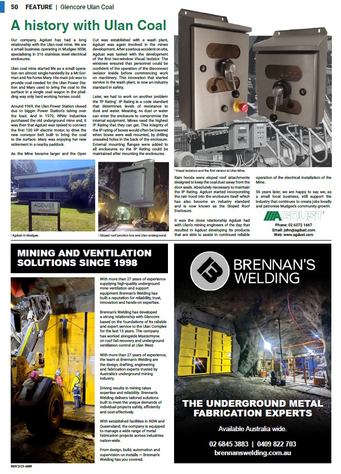 Brennan’s Welding has developed a strong relationship with Glencore based on the foundations of its reliable and expert service to the Ulan Complex for the last 13 years. The company has worked alongside Mastermyne on roof fall recovery and underground ventilation control at Ulan West.