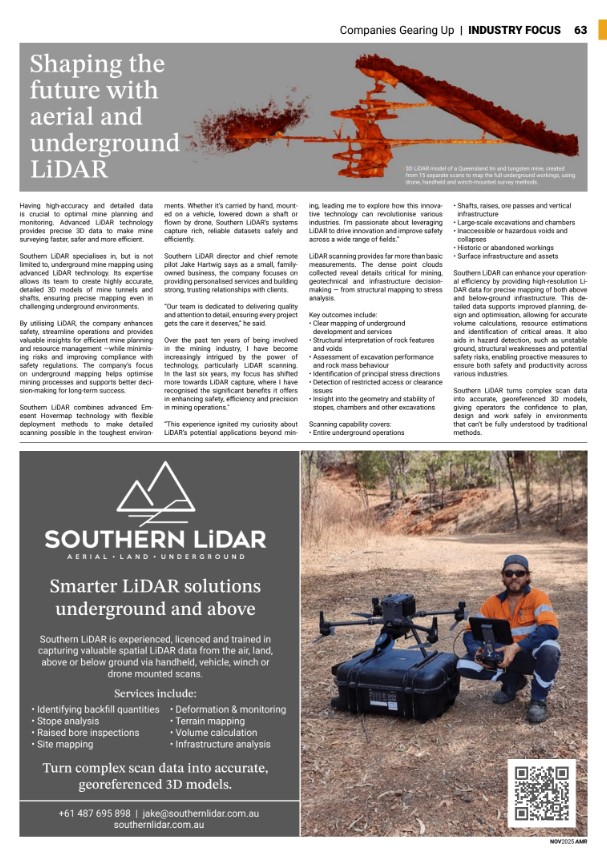 “Over the past ten years of being involved in the mining industry, I have become increasingly intrigued by the power of technology, particularly LiDAR scanning. In the last six years, my focus has shifted more towards LiDAR capture, where I have recognised the significant benefits it offers in enhancing safety, efficiency and precision in mining operations.”
