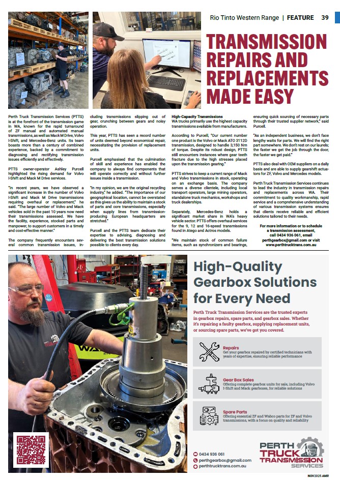 For more information or to schedule a transmission assessment, call 0434 936 061, email perthgearbox@gmail.com or visit www.perthtrucktrans.com.au/