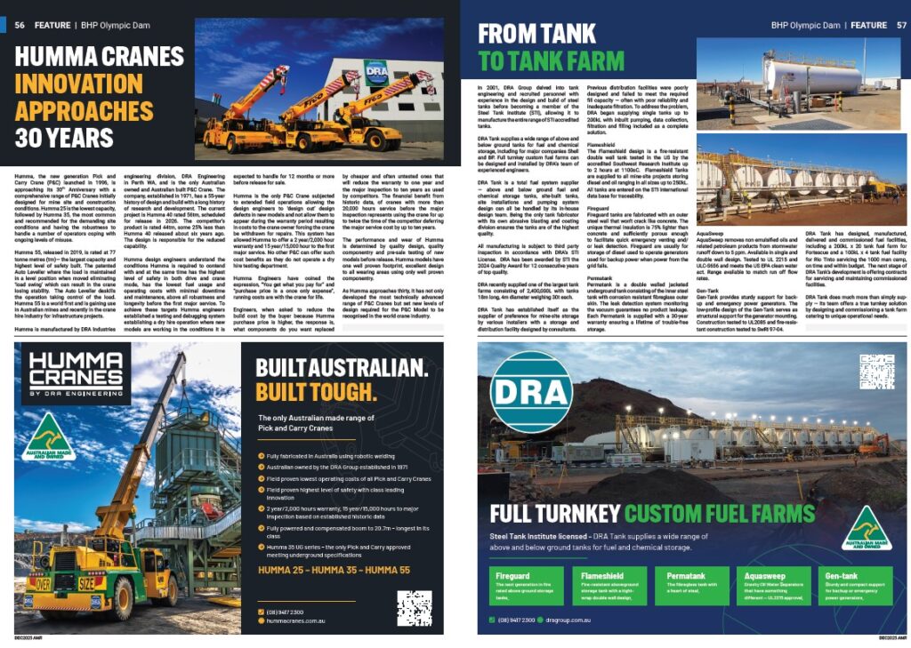 Humma is manufactured by DRA Industries engineering division, DRA Engineering in Perth WA, and is the only Australian owned and Australian built P&C Crane. The company, established in 1971, has a 55-year history of design and build with a long history of research and development. The current project is Humma 40 rated 56tm, scheduled for release in 2026. The competitor’s product is rated 44tm, some 25% less than Humma 40 released about six years ago. The design is responsible for the reduced capability.